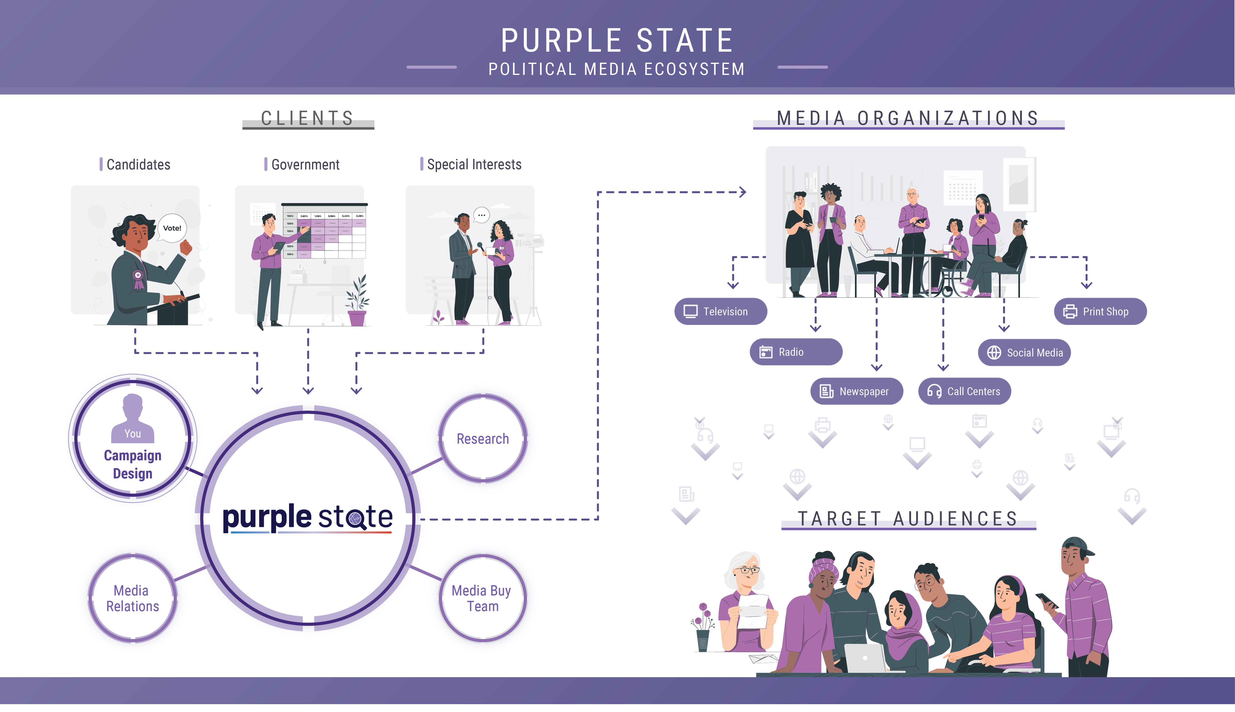 These reflective discussions are designed to have students consider the simulation in relation to their own experiences with political media and to examine the role of media, money, and groups in the US political system. Use the Reflective Questions above as well as the PurpleState Structure Infographic to facilitate discussion around students’ experiences so far as interns.